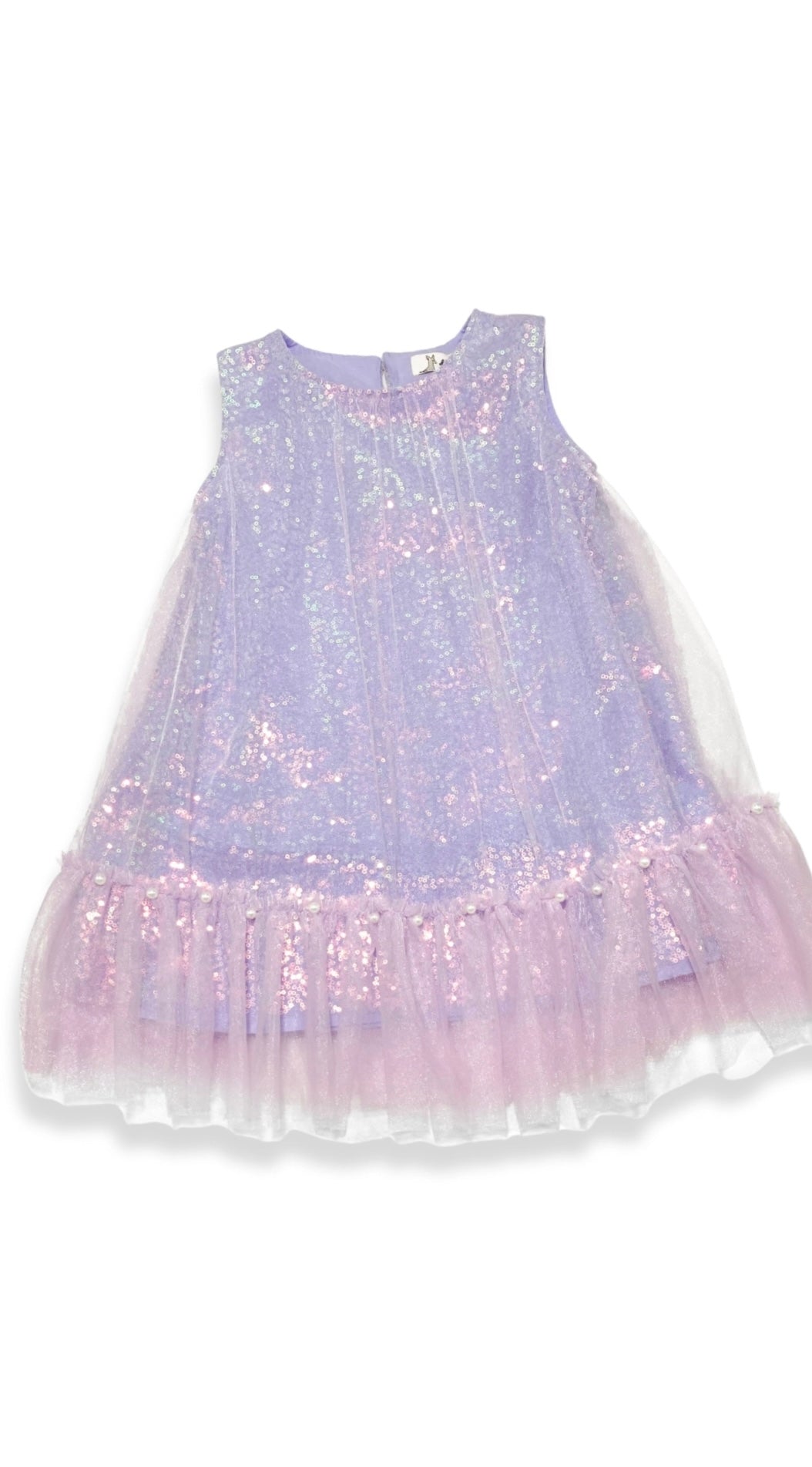 Make every moment sparkle with this enchanting little girl’s dress. The purple base shimmers with iridescent sequins, catching the light with every twirl. A soft light pink mesh overlay adds a dreamy, fairy-tale feel, while delicate pearl accents around the second tier hem give it a touch of timeless elegance. Perfect for parties, special occasions, or any day she wants to feel like a princess.