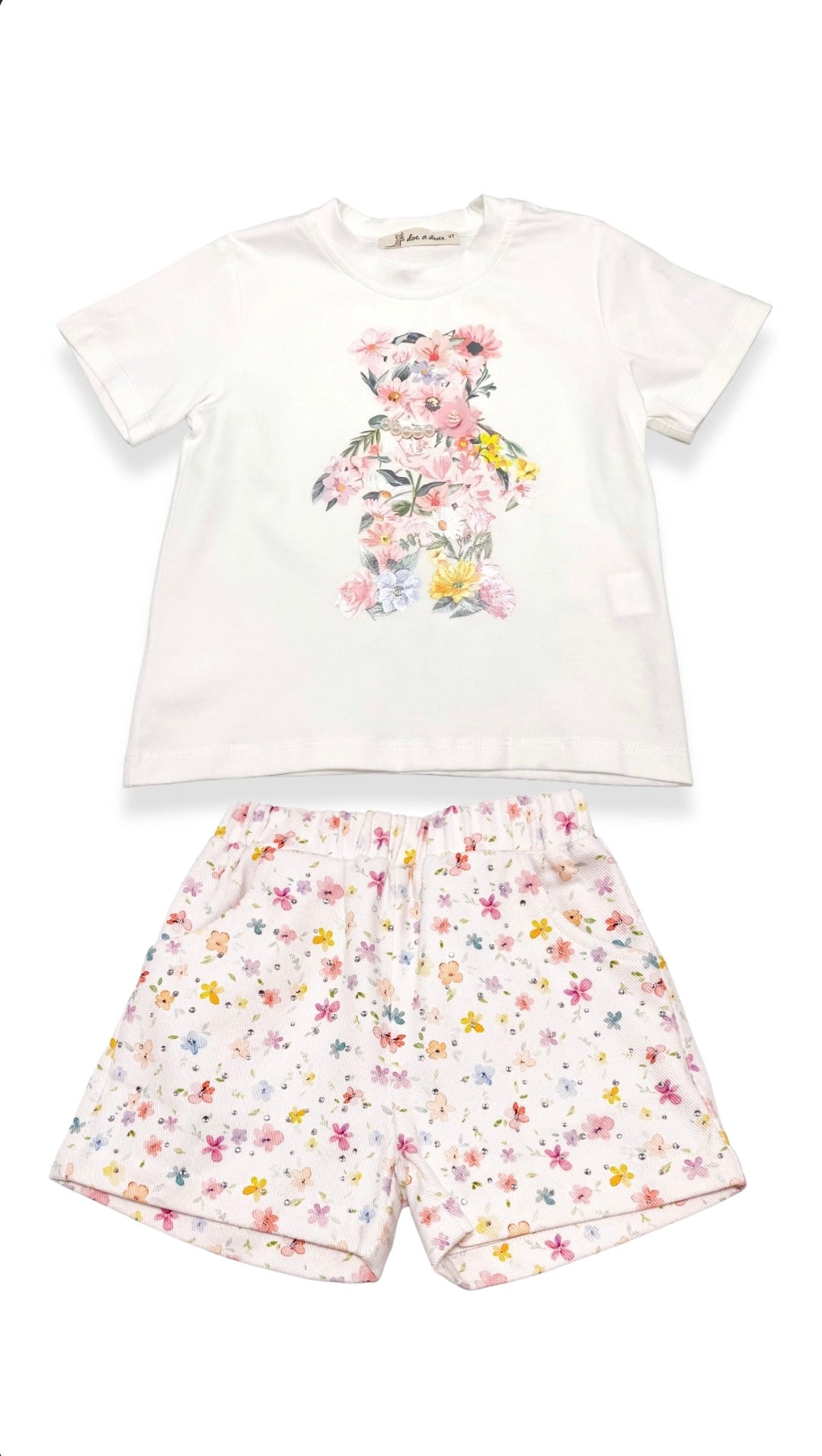 This adorable white tee shirt for little girls features a charming floral teddy bear graphic at the center. The teddy bear is adorned with a soft pastel floral pattern and wears a delicate pearl necklace, adding a touch of elegance and whimsy. Made from soft, breathable cotton, the shirt offers both comfort and style—perfect for everyday wear or special outings.