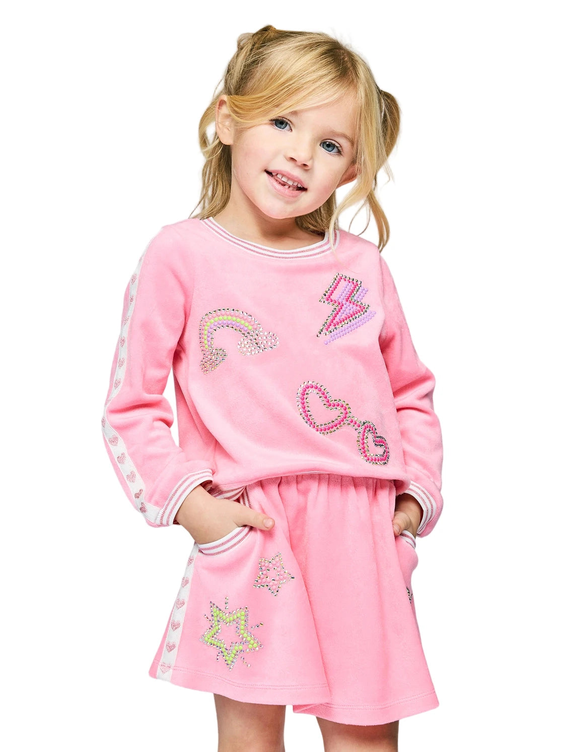 Bright, playful, and full of sparkle! This adorable two-piece set features soft pink velour decorated with colorful studs and rhinestone stars and rainbows for a fun, shimmering finish. Both the top and skirt are trimmed with sporty pink-and-white stripes, adding a cute contrast. A white strip with sweet heart accents runs down the side of the sleeves and skirt, bringing the whole look together. Perfect for a stylish, standout outfit with plenty of charm!